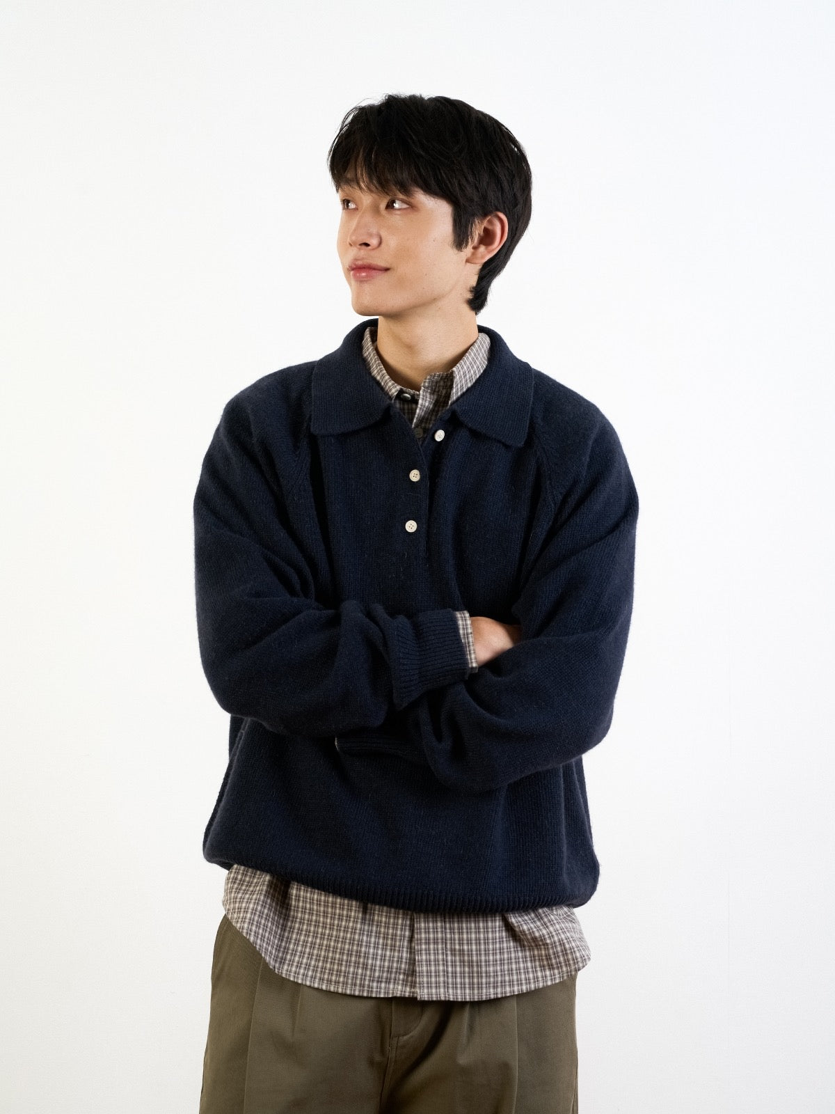 這款針織衫將氂牛毛和羊毛適當混合製成。質地溫和舒適,具備穩定的保暖性,不論季節皆可穿著。設計類似美式休閒風的Polo衫,其寬鬆的版型及平衡的翻領設計為特色,單穿或搭配外套皆自然合宜。