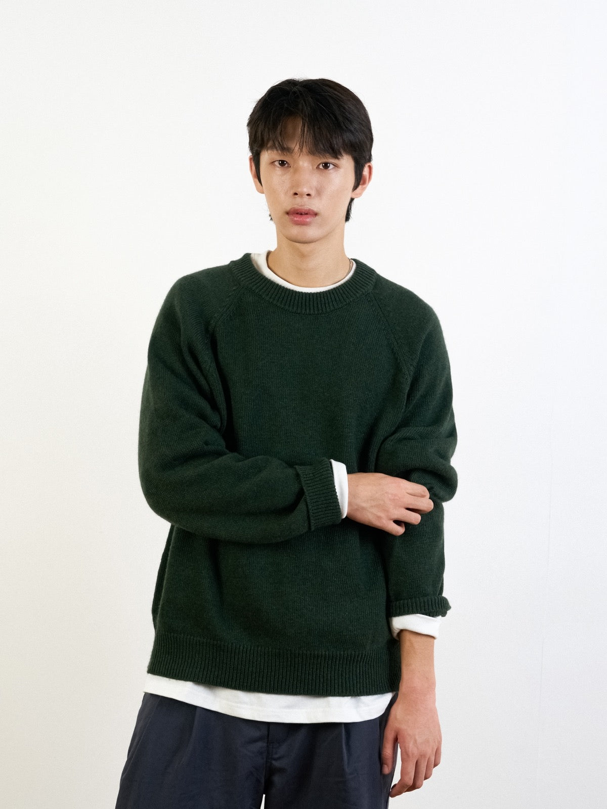 这是一款通过合理混合Yak和羊毛制成的圆领针织衫。虽为最基本款型,却以耐用的领口、宽松的版型以及自然下垂的插肩袖线条赋予了其独特的魅力。柔软到可以直接贴合皮肤,保暖性强,不受季节限制,不仅可以单穿,还能与衬衫或T恤叠搭,显得自然协调。